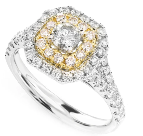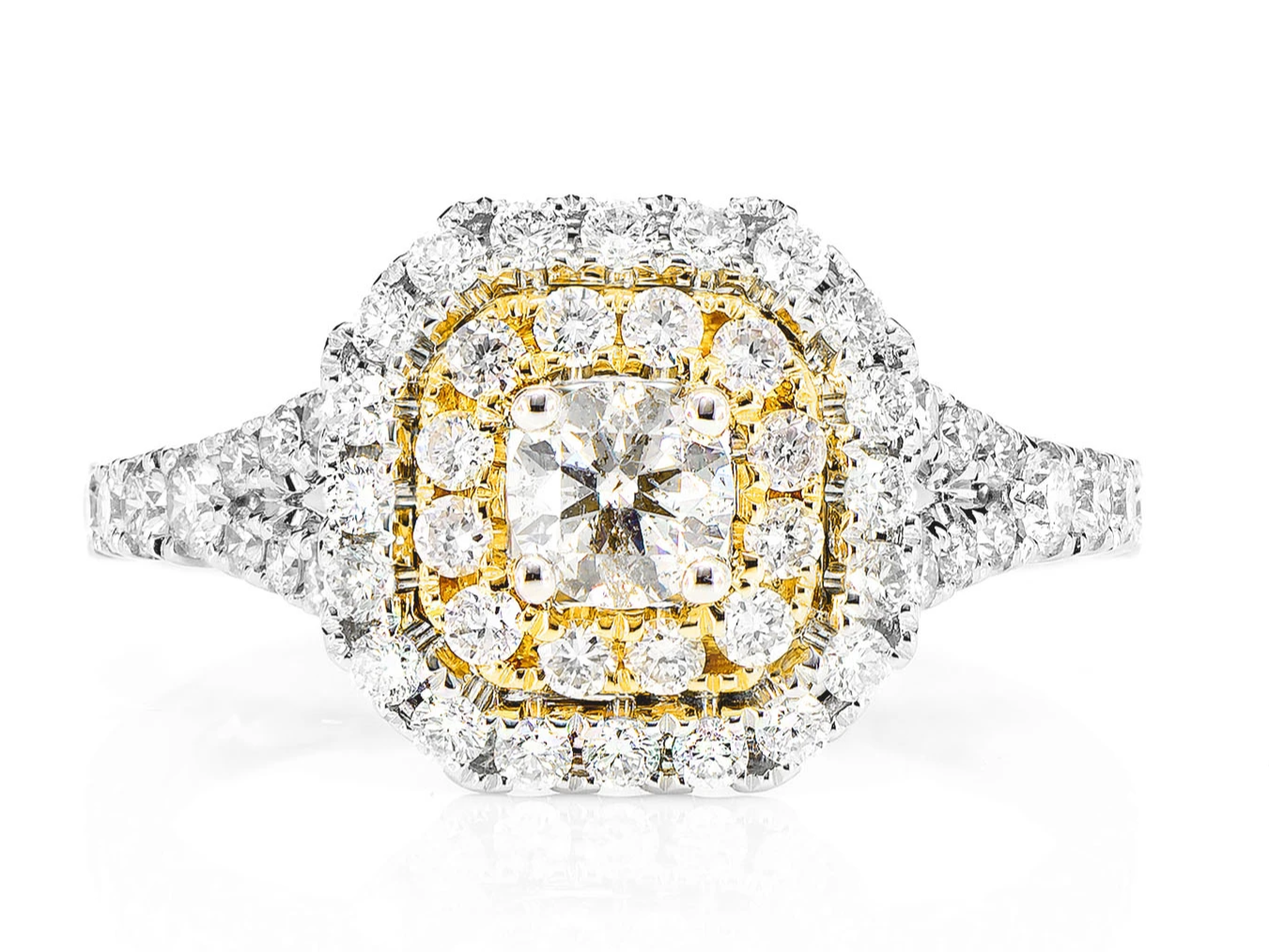• Sparkling diamonds surround the stone in a geometric double halo that is crafted from two colors of gold.