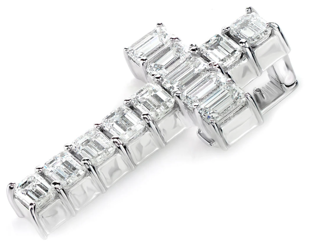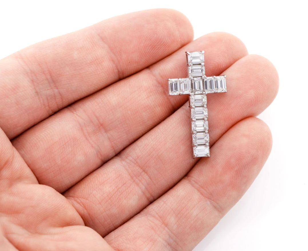 - This pendant, featuring 3.50ctw emerald-cut VS diamonds, is a remarkable symbol of faith.