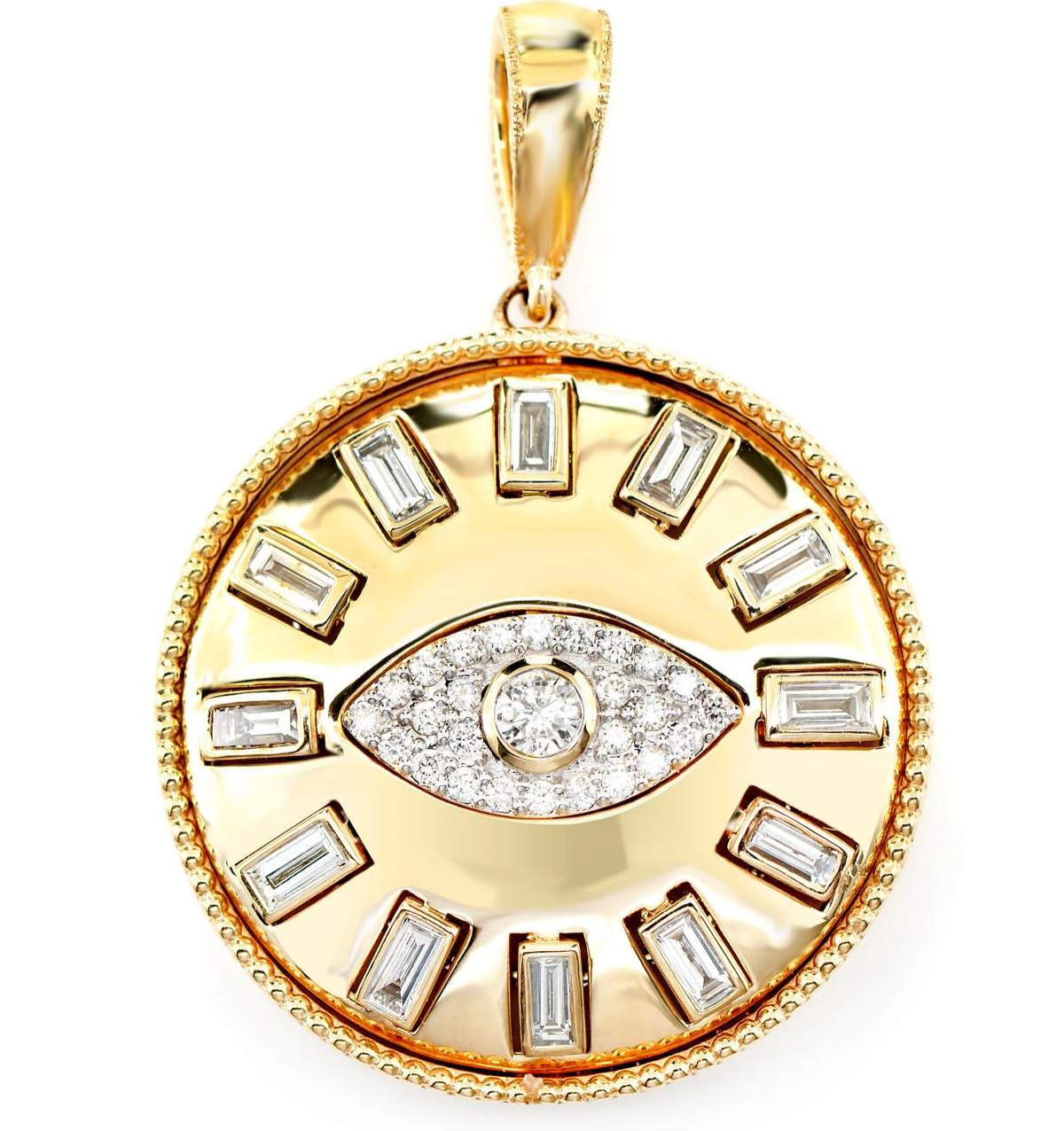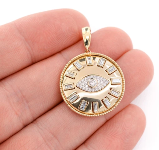 - This GSDKings Evil Eye Baguette Medallion Pendant is made of 14K Yellow gold.