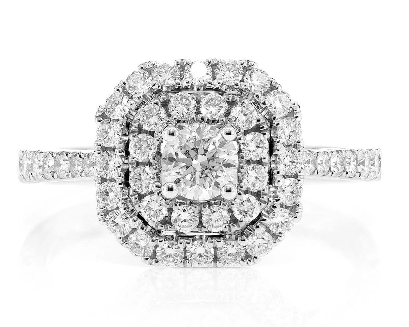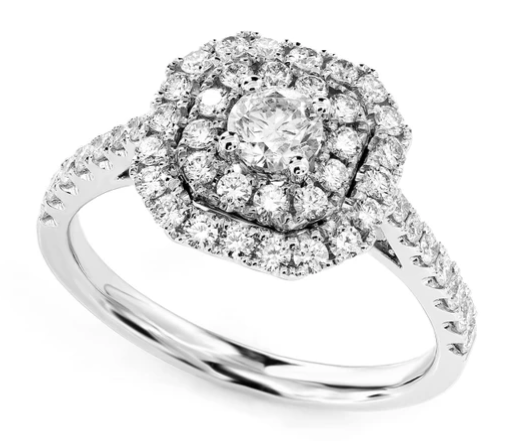 • The round center is framed by two shimmering halos that magnify its brilliance, while a split shank lined with diamonds completes the design.