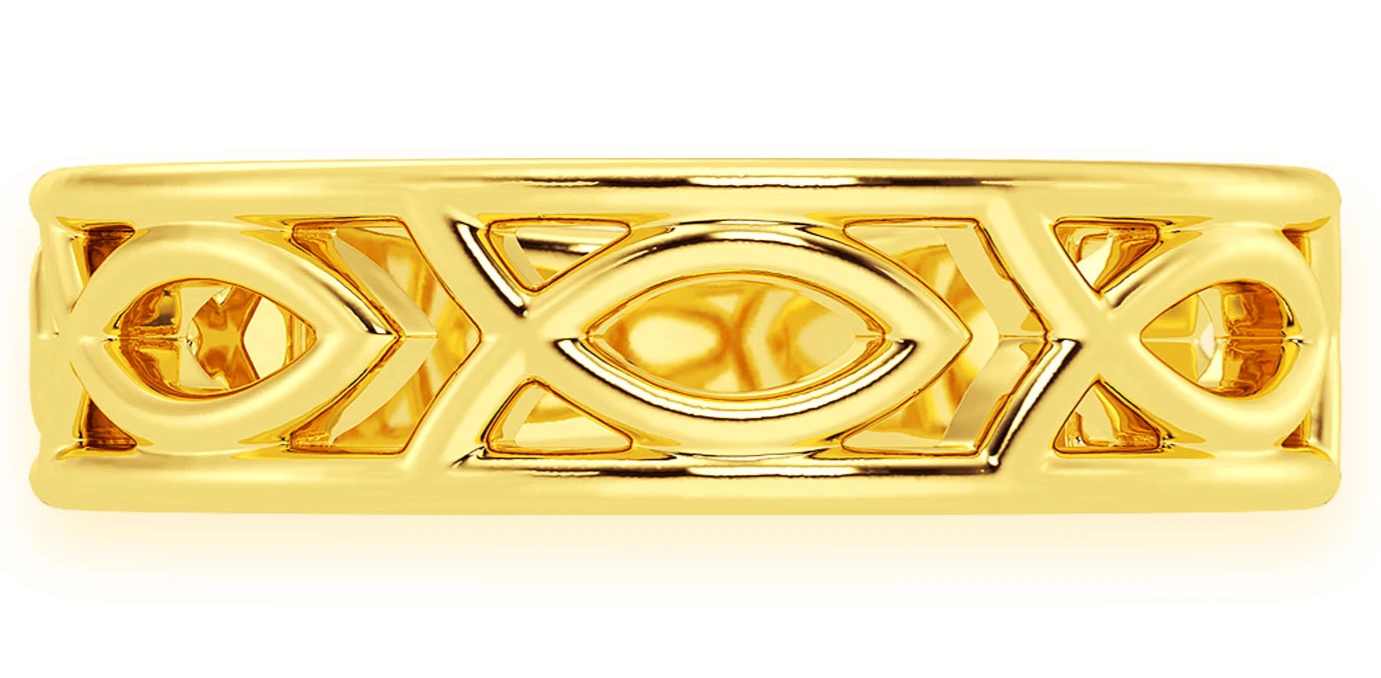 • This subtle yet high-polish solid 14K gold ring features a pattern with the Christian Ichthys fish.