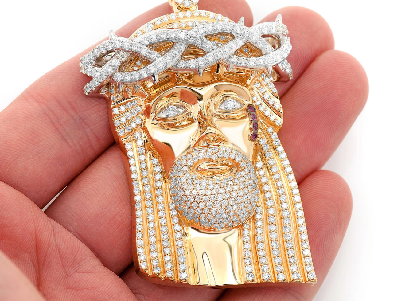 - The design features a large, detailed face of Jesus gleaming with 9.25ctw VS diamonds accenting parts of the sculpted facial features.