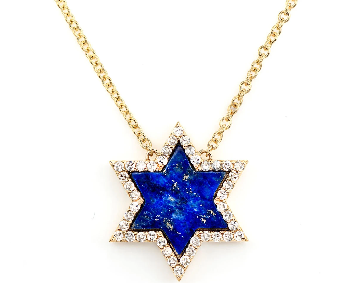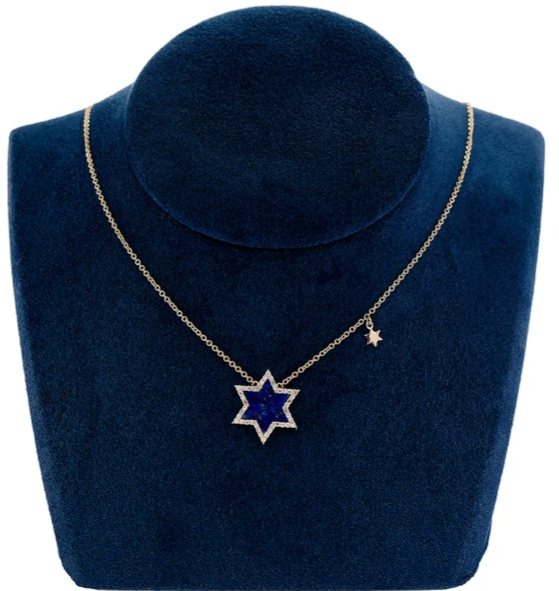 • This unique necklace features a striking Star of David pendant crafted from a deep blue lapis lazuli center and framed by a halo of shimmering diamonds.