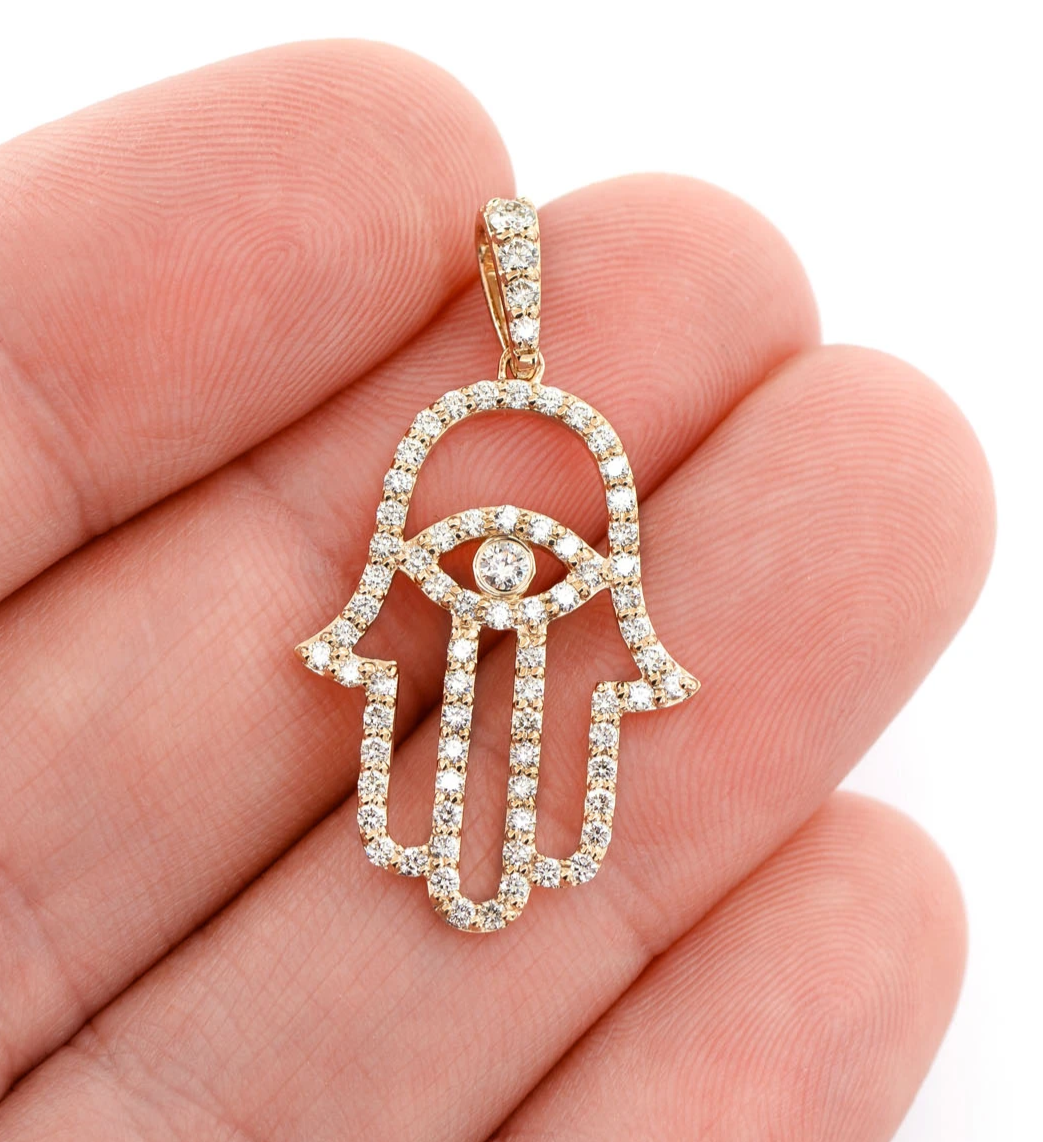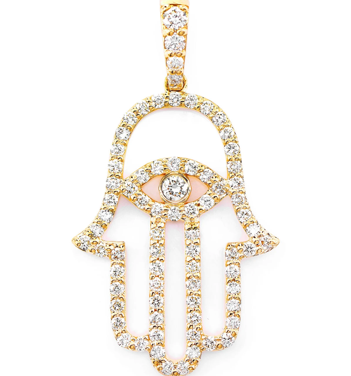 - This gorgeous and symbolic Open Hamsa Evil Eye Diamond Pendant shimmers with 0.85ctw diamonds.