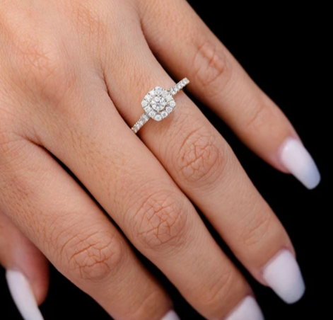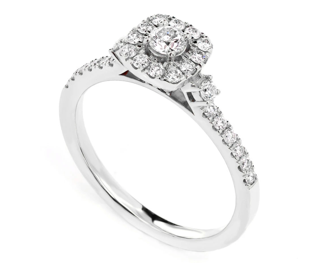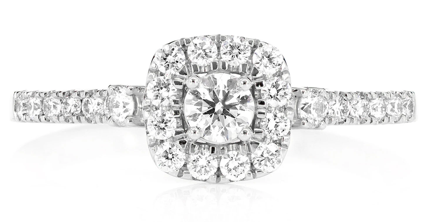 • This timeless sparkling engagement ring is sure to impress with its elegant halo style and scintillating sparkle.